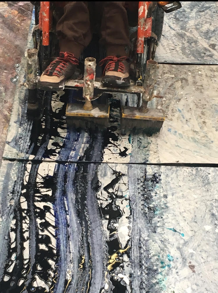 Così possono essere suggestivi paesaggi, città futuristiche, esplosioni di colori, materia che emerge quasi resuscitata dal segno della ruota della sua sedia con elementi e particolari che prendono vita man mano che l’osservatore diventa catalizzatore di un arte che è viva e in continuo mutamento."